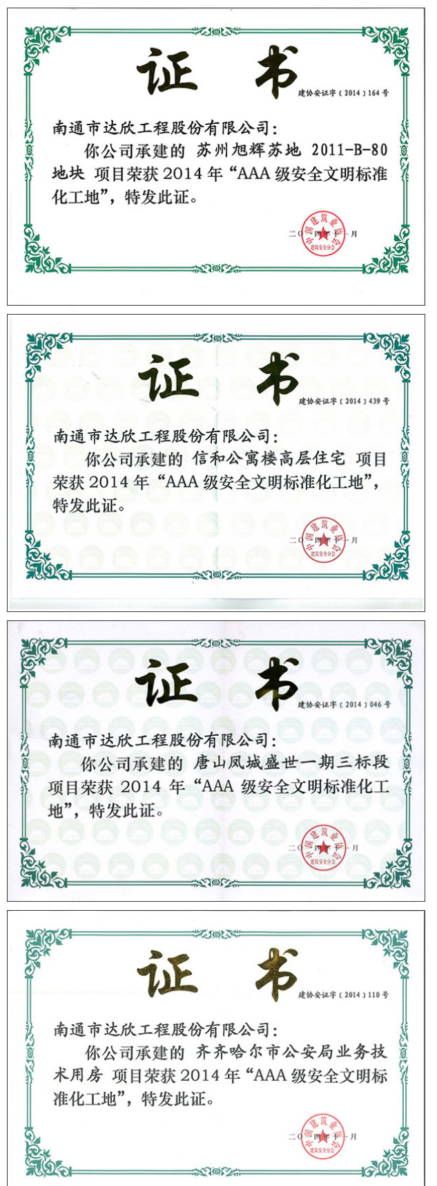 近幾年我公司獲得全國AAA級安全文明標準化工地16項,創建面涉及上海、江蘇、湖南、河北、黑龍江、新疆等市場,安全文明施工管理水平再上新臺階,榮譽的取得為進一步提升達欣品牌在全國各個市場的影響力,為進一步提升企業形象、促進企業長遠發展奠定堅實的品牌基礎。