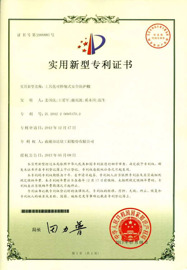 成果二提出了一種建筑施工現(xiàn)場用工具化可伸縮式的安全防護棚,將防護棚由通常的整體式結(jié)構(gòu)改成單元式、定型化、工具式結(jié)構(gòu),可根據(jù)場地需要組合成多種尺寸,且所有構(gòu)件單元可重復(fù)周轉(zhuǎn)使用,整體安裝方便快捷,從而提高各類安全防護棚的安裝速度和安全性,能較好的滿足施工現(xiàn)場的標(biāo)準(zhǔn)化、規(guī)范化、安全文明施工的要求,推進了科技進步。