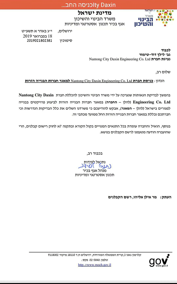 近年來,達欣集團積極響應國家“走出去”和“一帶一路”戰略,大力發展國際工程承包業務,此次中標以色列承包商資格,將為集團進一步拓展海外市場提供新的契機。