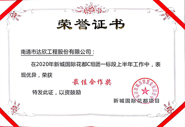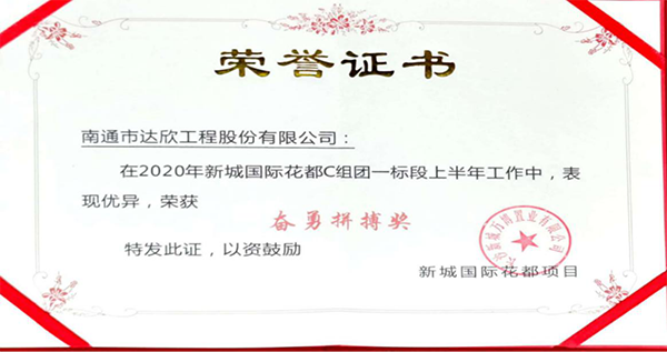 近日,新城國際花都C組團一、二標段項目,在公司各級領導的關心支持下,在項目全體施工人員的共同努力下,提前實現交付。為此,獲得長沙新城萬博置業有限公司工程授予的《奮勇拼搏》、《最佳合作》兩個獎項,博得了新城萬博置業有限公司對我司工作的高度認可。