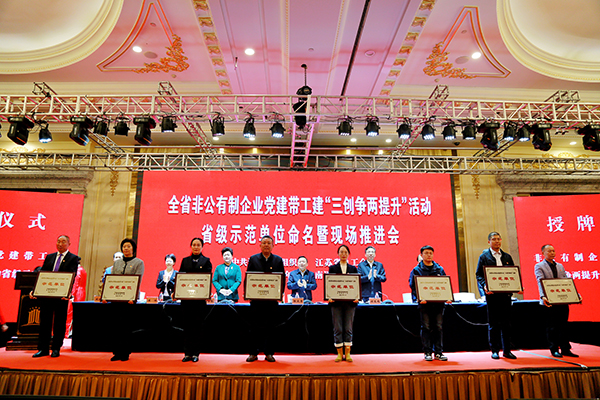 11月18日,江蘇省非公有制企業(yè)黨建帶工建“三創(chuàng)爭兩提升”活動省級示范單位命名暨現(xiàn)場推進(jìn)會在南通召開。會上,對100家江蘇省非公有制企業(yè)黨建帶工建“三創(chuàng)爭兩提升”活動示范單位進(jìn)行了命名,達(dá)欣集團(tuán)榜上有名,集團(tuán)副總經(jīng)理、工會主席溫鶴華作為單位代表上臺接受授牌。