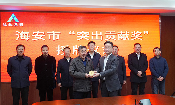 12月1日,海安高新區(qū)黨工委書記鄧加忠,黨工委副書記、管委會主任魯斌,黨工委副書記、科創(chuàng)園主任陸建銀,管委會副主任徐愛軍等領導,為企業(yè)“2021年度入庫稅金超億元”,舉行“突出貢獻獎”授牌儀式。這是繼去年集團榮獲此項獎牌后,再次受到當?shù)卣挠忠淮渭为劰膭睢<瘓F領導馬和軍、劉厚純等出席授牌儀式。