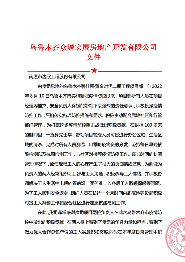 1月10日,集團(tuán)公司收到來自烏魯木齊眾城宏展房地產(chǎn)開發(fā)有限公司的一封表揚(yáng)信,信中對集團(tuán)第十一公司烏魯木齊碧桂園·黃金時(shí)代二期工程項(xiàng)目部,自2022年8月10日烏魯木齊市實(shí)施新冠疫情防控以來,項(xiàng)目部全體人員在疫情防控和項(xiàng)目建設(shè)中表現(xiàn)出的責(zé)任與擔(dān)當(dāng)表示感謝。內(nèi)容詳見附件:
