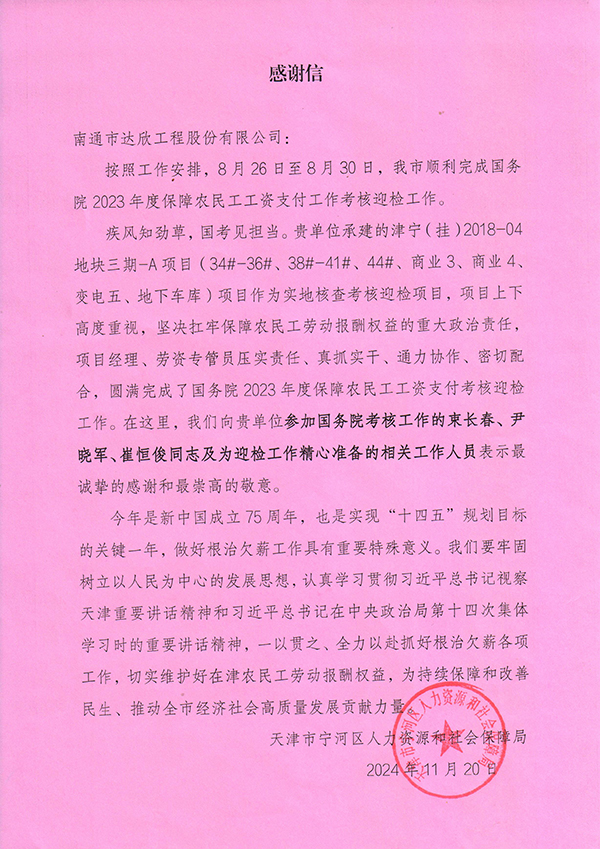 近日,第六工程公司承建的津寧(掛)2018-04地塊項目三期工程代表天津市參加2023年度國家級省際交叉核查,在國務院針對省級根治欠薪工作整體情況的檢查中成績優異,榮獲“標桿項目”榮譽稱號,并對迎檢過程中全體工作人員真抓實干、通力協作的精神表示感謝。